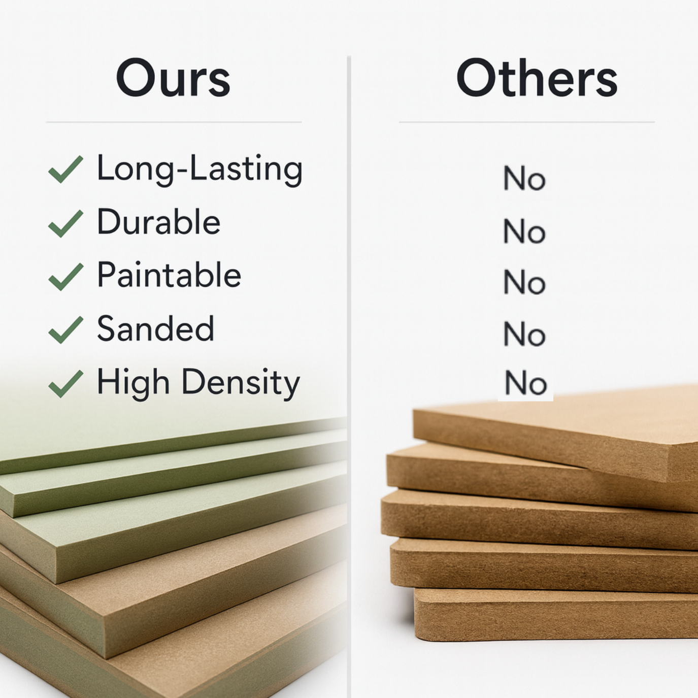 For higher-moisture areas (bathrooms, utility rooms), we also offer Green MR Moisture-Resistant MDF as an optional upgrade.