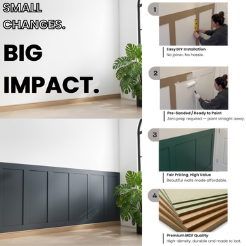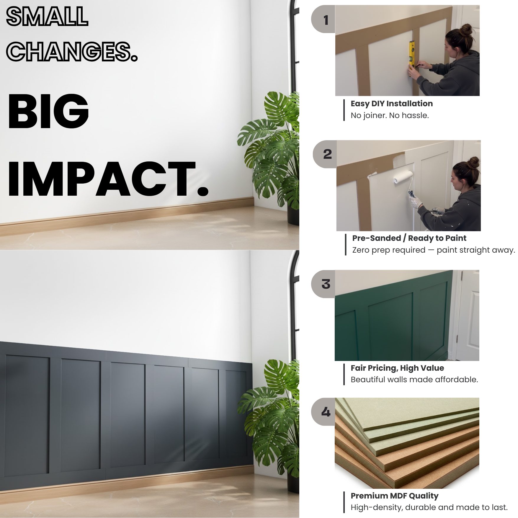 Transform your living room instantly with our premium shaker-style wall panelling kit. All panels are precision-cut in the UK using FSC-certified MDF and available in multiple thicknesses, lengths and accessories — so you can customise the exact look you want.